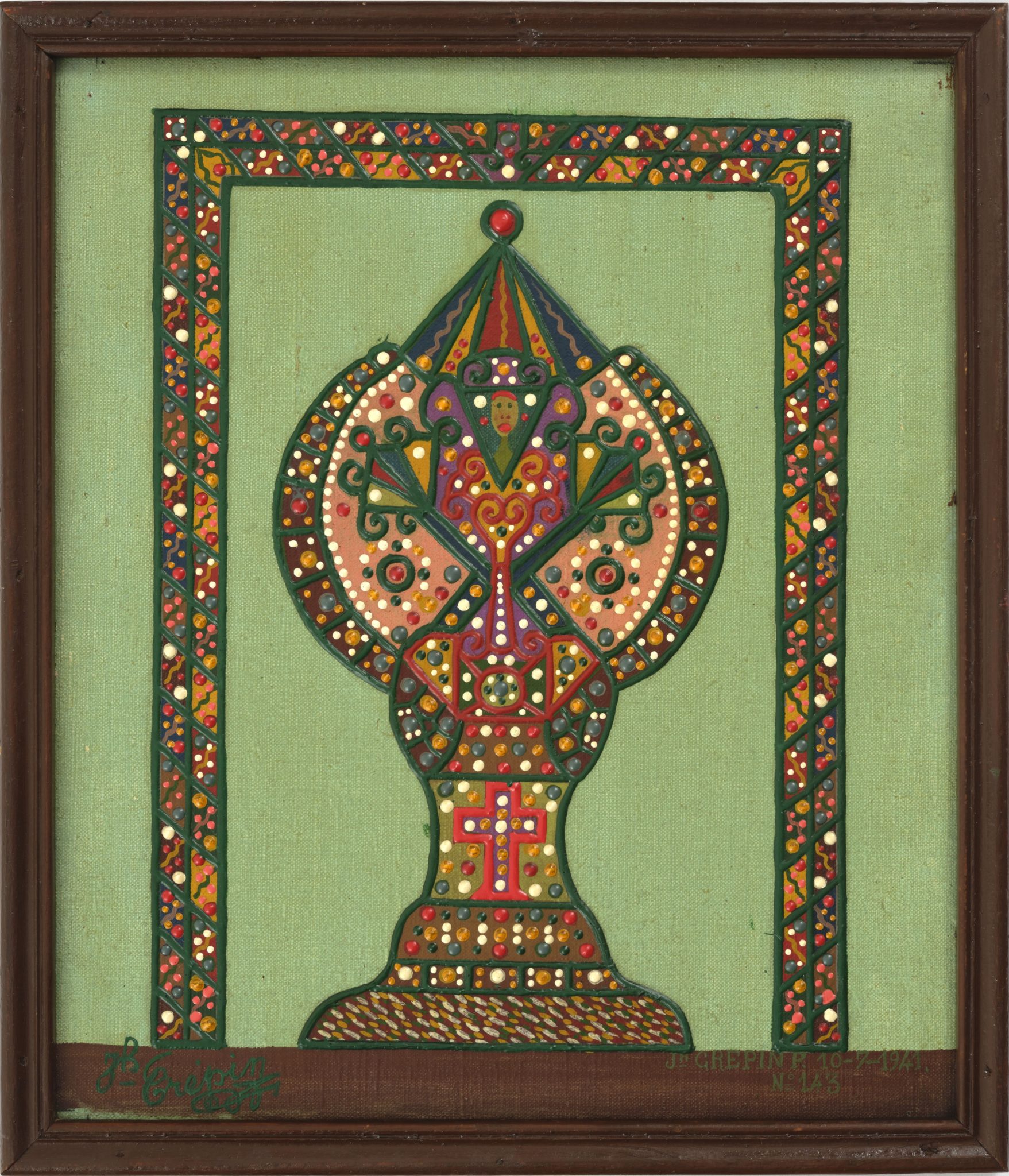 L’un des tableaux méticuleux, magnétiques et vibrants de Fleury Joseph Crépin (1875-1948), plombier zingueur, quincaillier et guérisseur né dans le Pas-de-Calais, à quelques kilomètres de deux autres « peintres sans l’avoir appris » et se disant guidés par l’au-delà, Augustin Lesage (1876-1954), mineur de fond, et Victor Simon (1903- 1976), cabaretier.